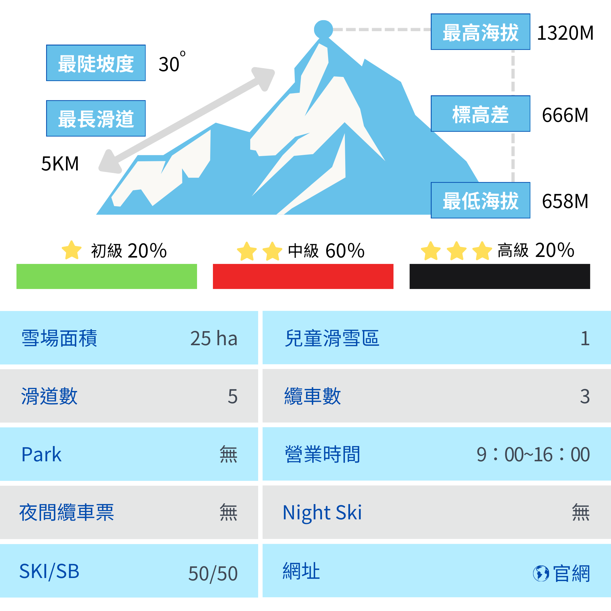 有著日本頂級的積雪量和粉雪!滑雪場積雪量穩定,約在每年12月上旬開始營業直到5月的黃金週結束。坐擁東北最大規模的非壓雪林間滑雪區,由一般雪道和廣闊的林間雪道組成,總滑行距離長達14,100公尺。滑雪場內備有適合初學者的緩坡雪道、可從起點處觀景台眺望鳥海山和岩手山全景的雪道、貓跳滑雪道等,從初學者到高手都能盡興。